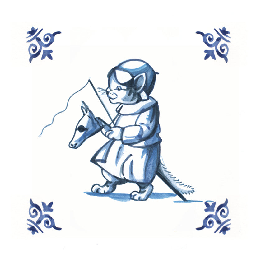 Kleurrijke koelkastmagneet met Kat (delfsblauw) - Paardje Rijden. Afmeting 6,5  x 6,5 cm.  Dikte: 0,3 cm. De koelkastmagneten zijn per stuk verpakt. Minimale afname per design is 5 stuks