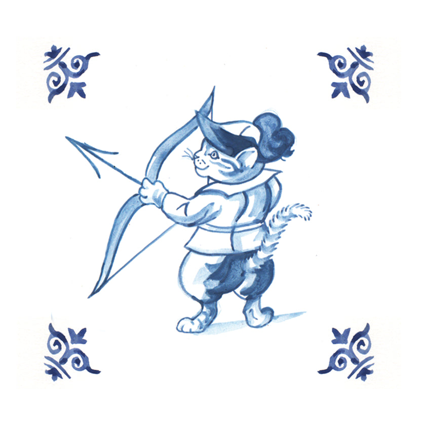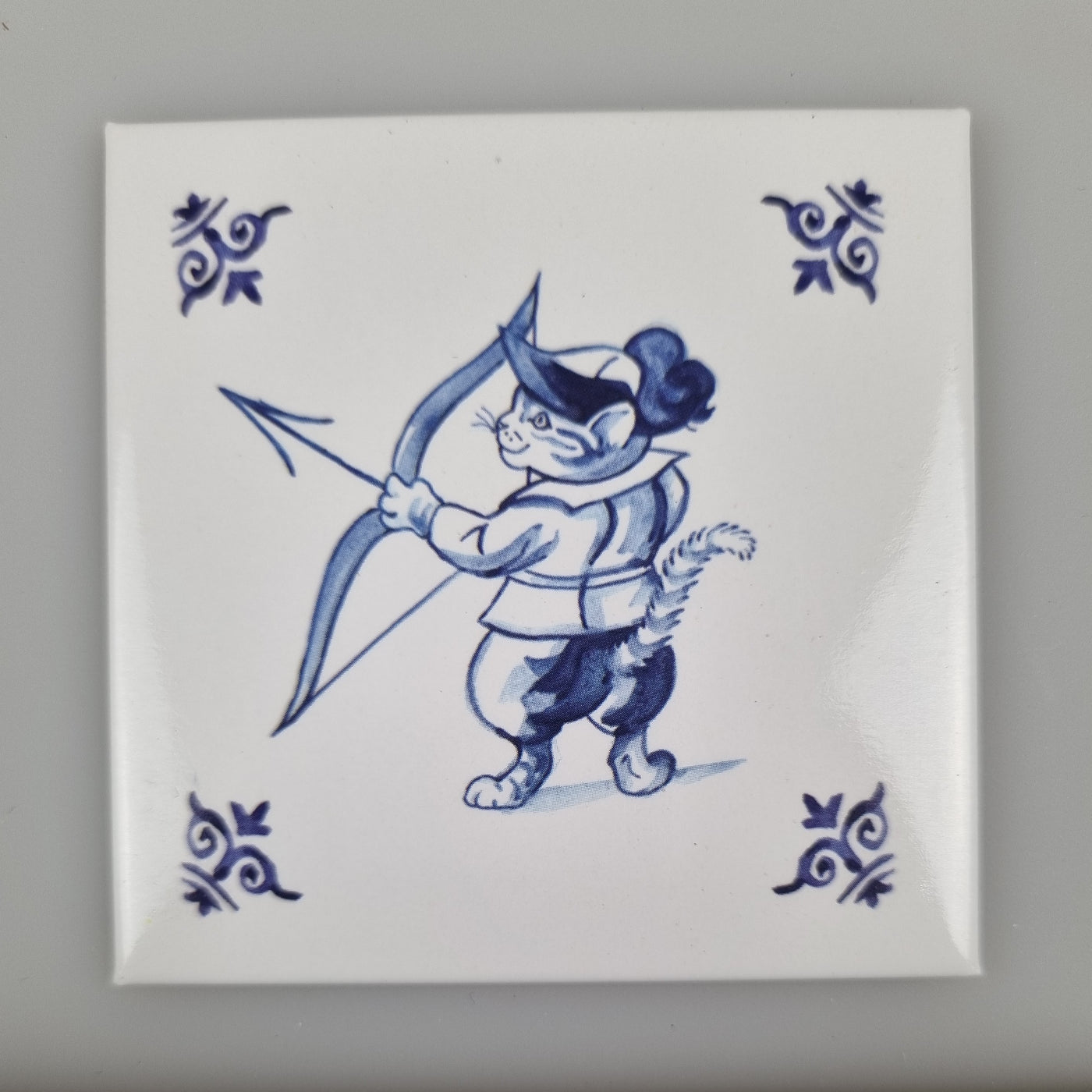 Kleurrijke koelkastmagneet met Kat (delfsblauw) - Boogschieten. Afmeting 6,5  x 6,5 cm.  Dikte: 0,3 cm. De koelkastmagneten zijn per stuk verpakt. Minimale afname per design is 5 stuks