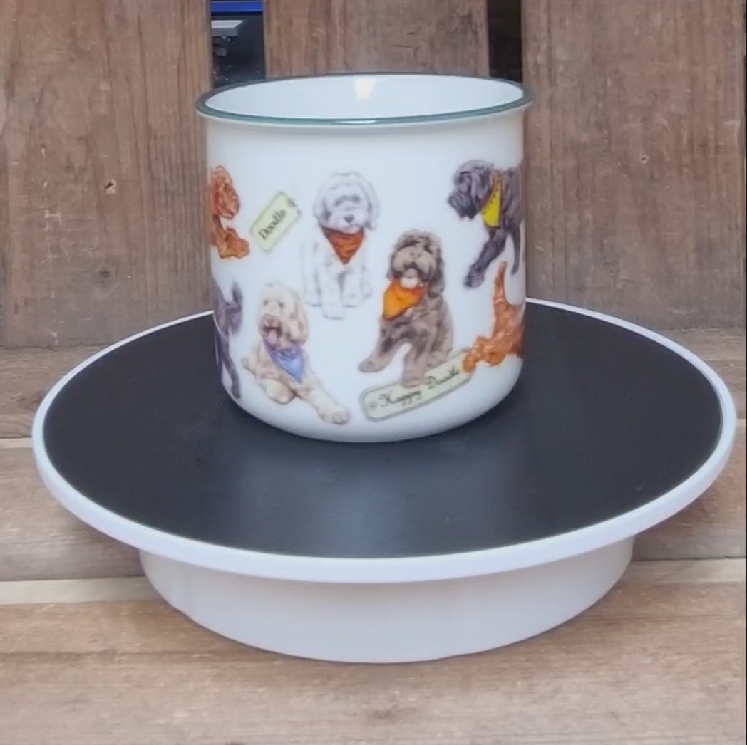 Fröhliche Tasse mit vielen kleinen Labradoodle -Illustrationen