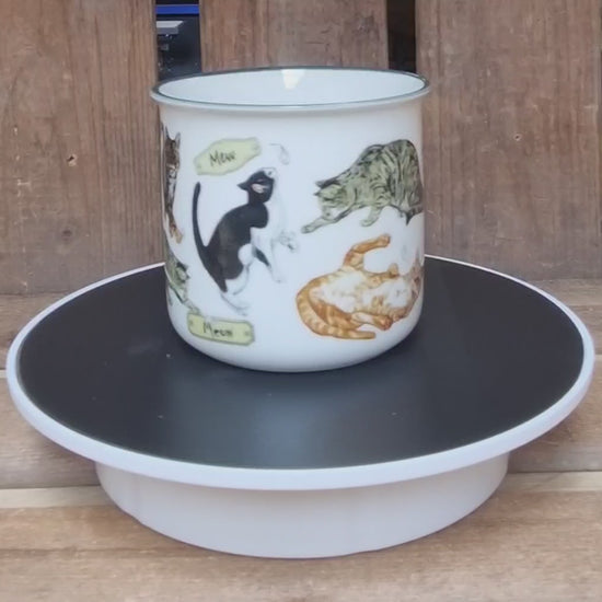 Dieser Becher sieht aus wie ein Emaillebecher, ist aber tatsächlich aus Steingut gefertigt. Dadurch lässt er sich leichter daraus trinken und die Gefahr, sich beim Trinken die Lippen zu verbrennen, wird vermieden.