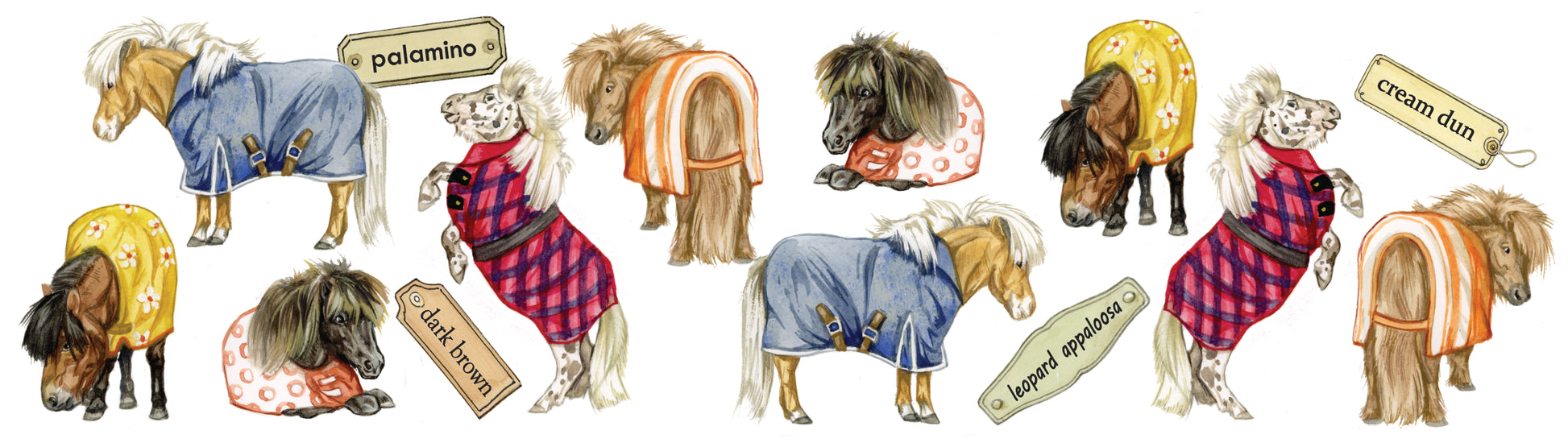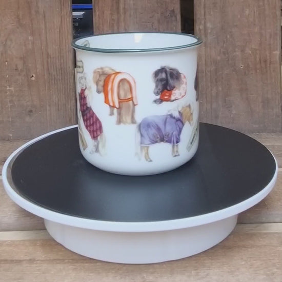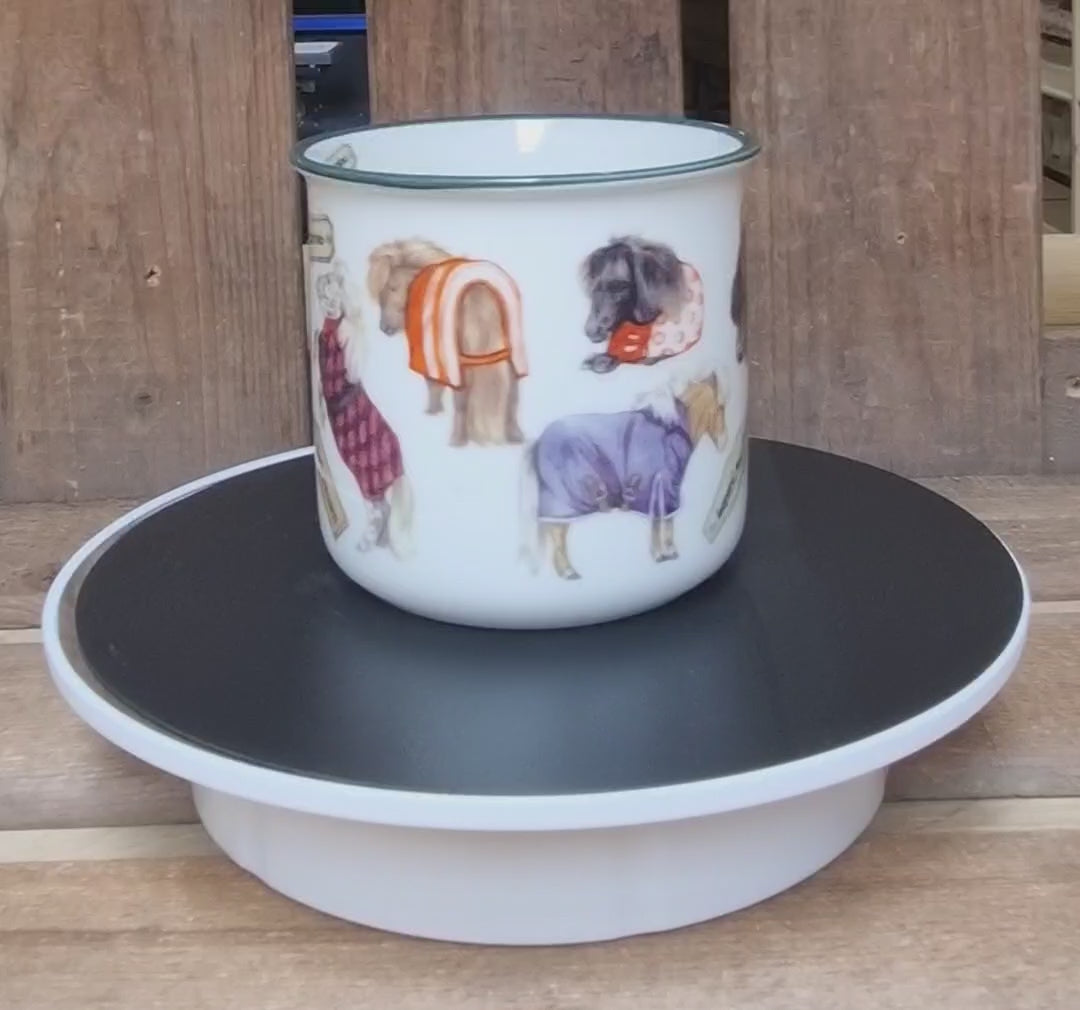 Fröhliche Tasse mit vielen kleinen Illustrationen von Shetlandponys