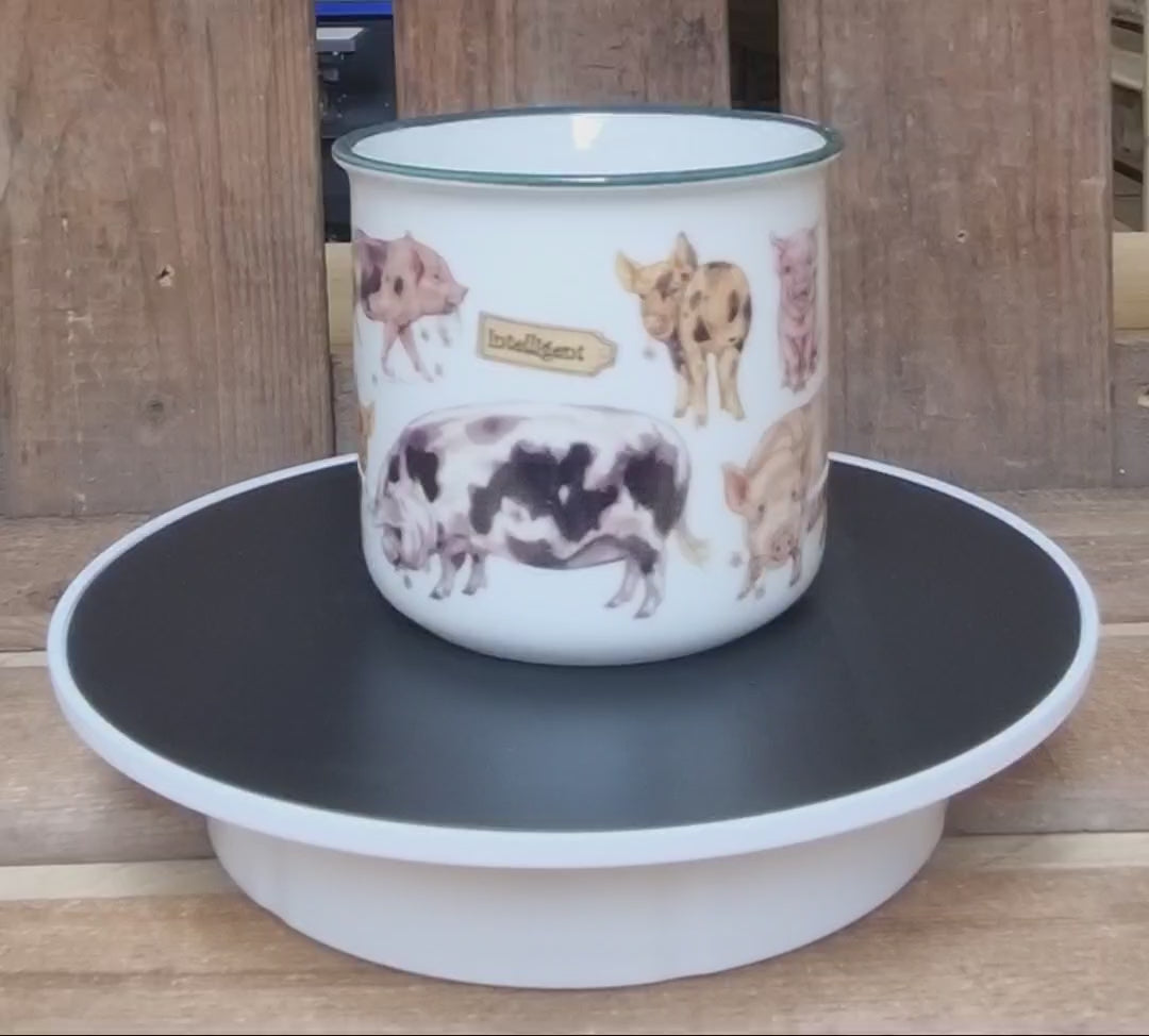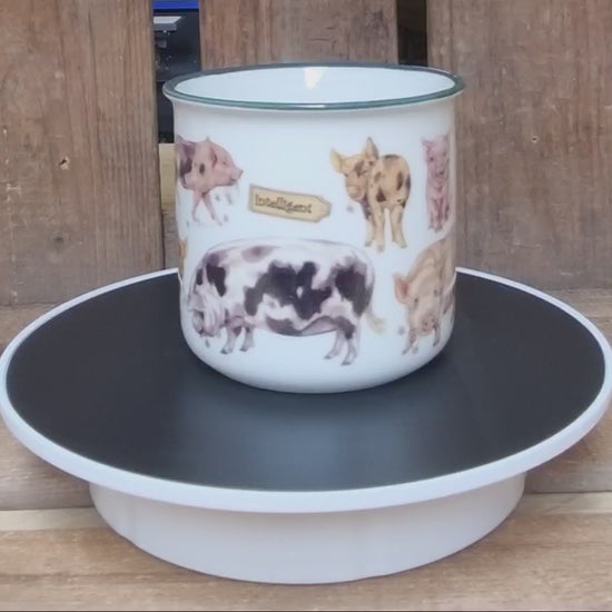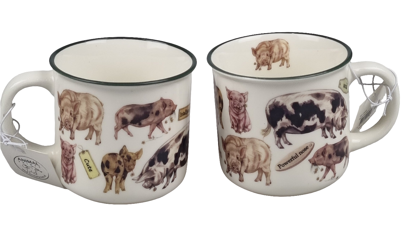 Fröhliche Tasse mit vielen kleinen Schweinchenabbildungen