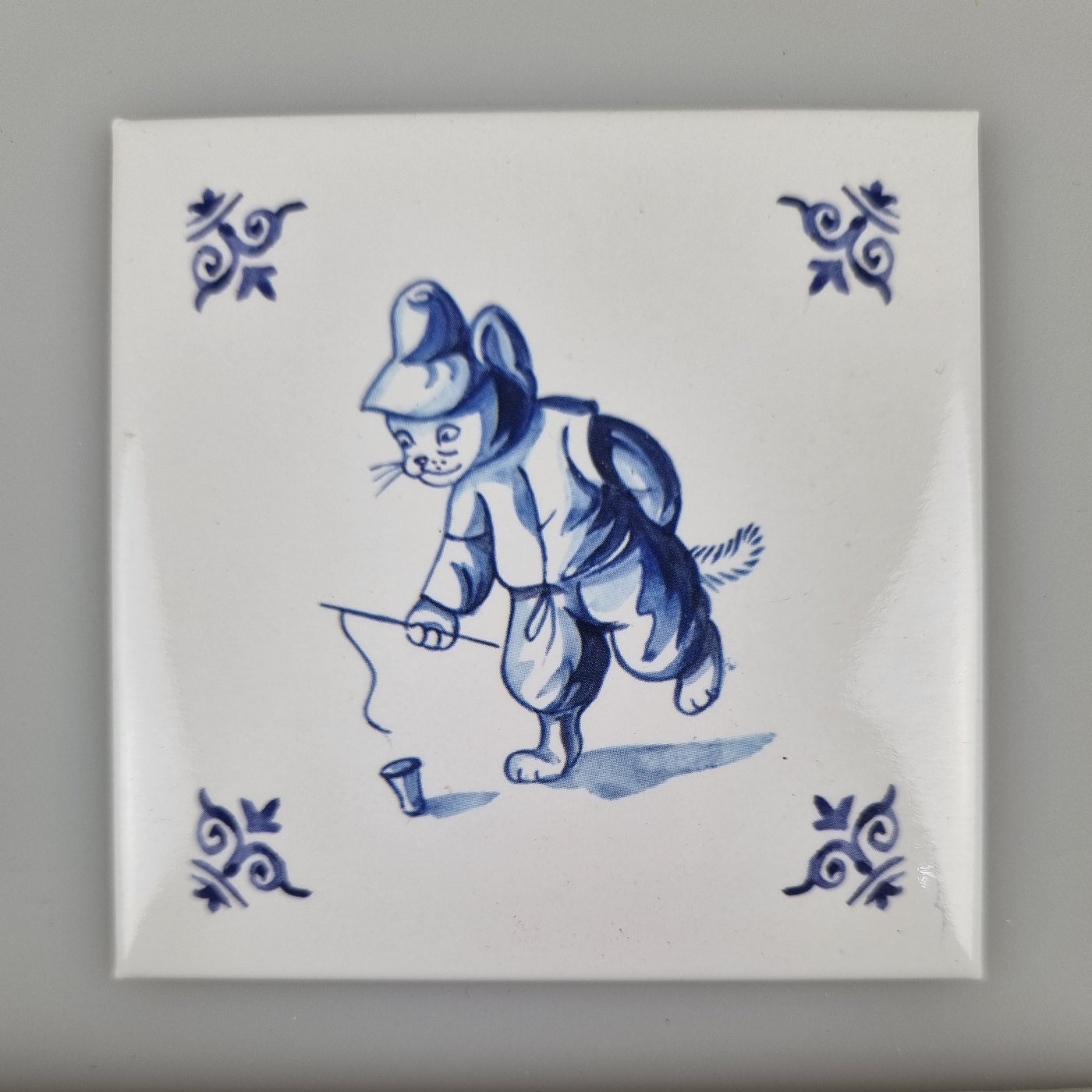 Bunter Kühlschrankmagnet mit Katze (Delftblau) - Spielt mit einem Kreisel.