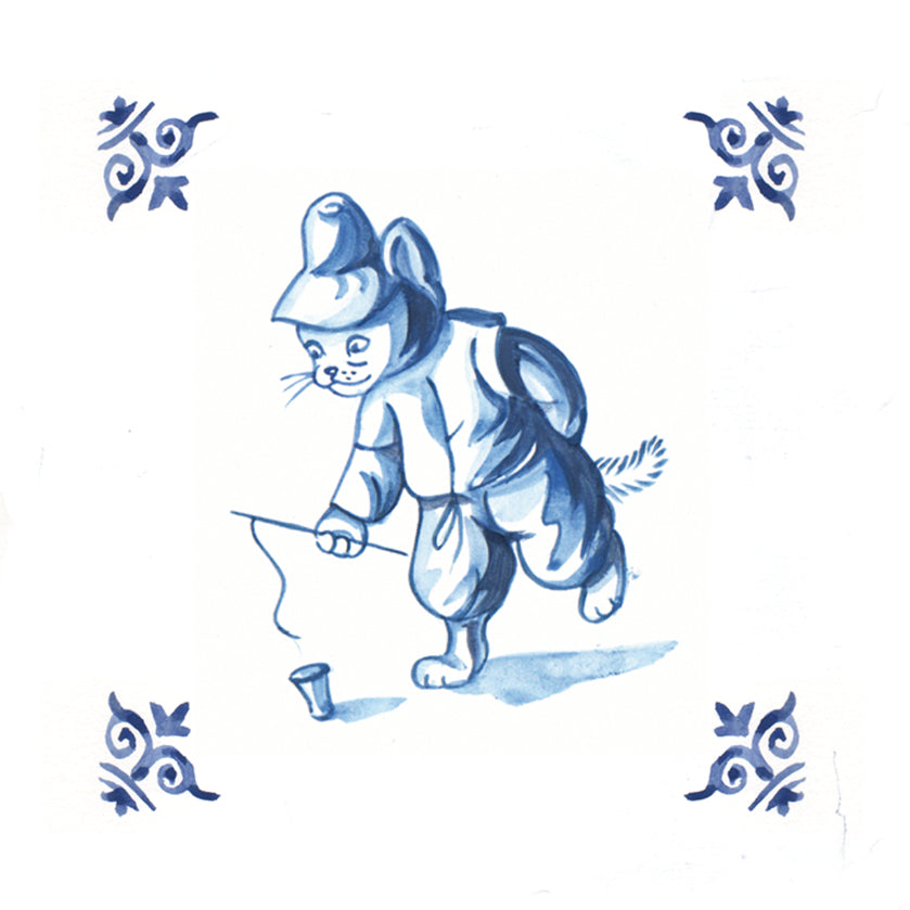 Kühlschrankmagnet - Katze (Delft-Blau) - Spielt mit einem Kreisel
