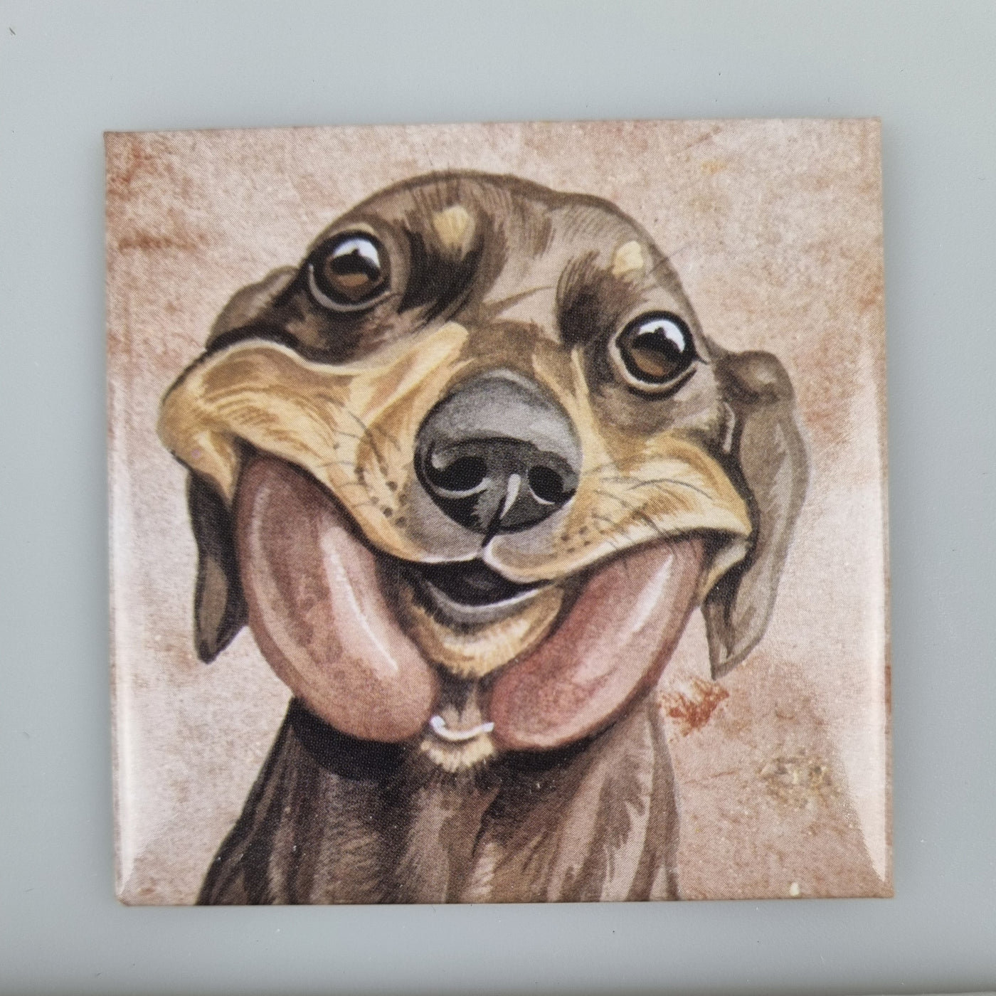 Kleurrijke koelkastmagneet met Teckel met worstjes.
