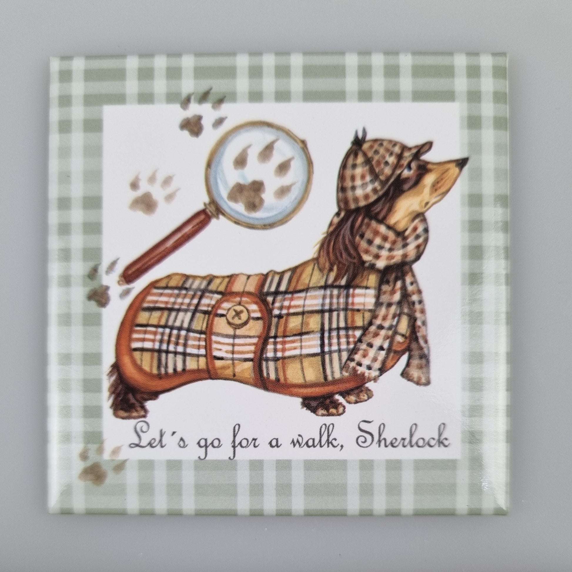 Kleurrijke koelkastmagneet met Teckel als Sherlock Holmes.